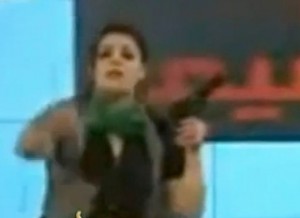 Well this is something you don’t see everyday. A news presenter for the pro-Gaddafi state run al-Libiyah channel in Libya showed support for the embattled dictator by brandishing a pistol and averring her embattled leader Muammar Gaddafi. The anchor is Hala Misrati, who earned international attention in April when she denounced a woman who had claimed to have been raped by pro-Gaddafi army members, calling her a “liar” and suggesting she was a “whore.”