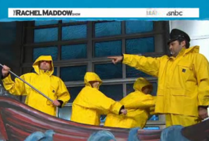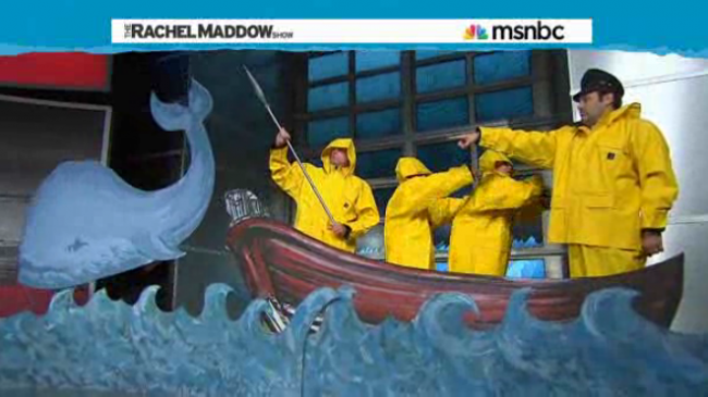 Sometimes in cable news, to get a point across, you might use a prop or two, a visual aid to help crystallize what it is you’re actually saying. On Tuesday night, Rachel Maddow decided to go all-out with what looks like a high school production of Moby Dick right in her studio, with her staffers on a giant fake whaling ship, and with one of them holding a fake harpoon.