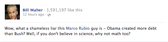 What many of Maher’s fiercest critics fail to point out is that a significant portion of Obama’s debt went to digging the country out the economic crisis that began under Bush. So while Rubio’s facts may have been technically accurate, they don’t exactly paint the full picture. Perhaps Maher should have gone with “shameless deceiver.”
