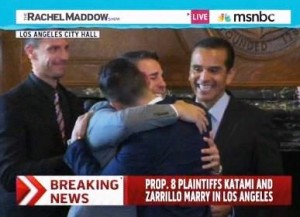 Paul Katami and Jeff Zarillo were one of the two couples who were plaintiffs in the Proposition 8 case that was struck down at the Supreme Court this week. Initially it was expected that gay couples would need to wait a while, but thanks to the efforts of Attorney General Kamala Harris, as of today gay and lesbian couples can get legally married in California. Harris conducted the marriage ceremony for the first couple in the Prop 8 case, and tonight, Rachel Maddow aired Katami and Zarillo’s wedding for her viewers to join in the happy occasion.