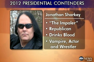 This morning, ABC News took a look at the 76 people who have already filled out paperwork to run in the upcoming Presidential election. The most interesting, perhaps, is Jonathon “The Impaler” Sharkey. Sharkey is a vampire. You can tell because he wears dark clothes and sunglasses and because “The Impaler” hasn’t been a popular nickname in like forever.