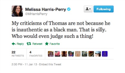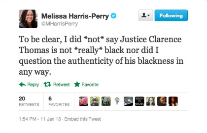 After receiving much criticism for defending President Obama‘s white, male cabinet by saying that Supreme Court Justice Clarence Thomas doesn’t hold views that are representative of “the vast majority” of African-Americans, MSNBC host Melissa Harris-Perry attempted to clarify her comments via Twitter Friday, saying, “To be clear, I did *not* say Justice Clarence Thomas is not *really* black nor did I question the authenticity of his blackness in any way.”