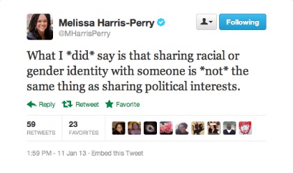 Over the course of several Tweets, Harris-Perry suggested that those interested in “something other than inaccurate soundbites” read her book. She clarified that in her book, she “argued Thomas & other black conservatives are part of a long tradition within black communities.” She also noted that what she was trying to express was that “sharing racial or gender identity with someone is *not* the same thing as sharing political interests.”