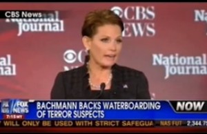 Saturday night’s CBS News-hosted GOP Debate focused on U.S. foreign policy, so it should come as no surprise that the issue of waterboarding enemy combatants, and its definition as torture, has been reintroduced as a topical subject for debate on opinion news programs in the days that have followed. Rep. Michele Bachmann called in to America’s Newsroom on Fox News and was asked to respond to President Obama‘s dismissal of waterboarding as a useful and appropriate technique. Bachmann defended waterboarding by comparing it to President Truman‘s decision to drop nuclear weapons on Japan in World War II. Huh.