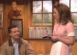 Last week on Saturday Night Live we heard from surprise second place primary finisher Rick Santorum, and this week New Hampshire primary winner Mitt Romney kicked off the show with a personal message to voters from “Jim-Bob’s kitchen,” a diner in South Carolina. The sketch was predicated on Romney’s total inability to engage in the folksy patter that voters like to see from their presidential candidates, and his tendency to instead do things like make offensive assumptions about people’s ages! Despite taking care to mention details like that of his “human sons,” Romney’s attempt to explain away his “I like firing people” gaffe was unsuccessful…mostly because it didn’t make much sense.