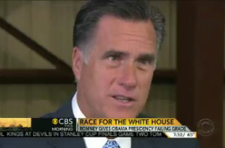 On Friday’s edition of CBS This Morning, reporter Jan Crawford interviewed presumptive Republican nominee Mitt Romney in a California airport hangar between campaign stops. When asked to give President Barack Obama a grade for his presidency, Romney gave him an “F … across the board.”