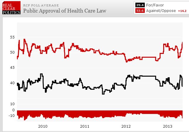 Compare this with the trajectory of the president’s average job approval rating, via Real Clear Politics, over the course of one month of sustained media coverage of the ACA’s implementation: