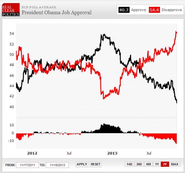 The president’s job approval has reached an all-time low with an average 54 percent of voters disapproving of the job he has done in office. As National Journal’s Alex Roarty capably demonstrates, once second term presidents enter this terminal slide in public approval, they almost never bounce back.