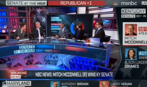 Rachel Maddow thought that Grimes may have been “shellshocked” by how badly she lost (polls showed her running neck-in-neck with McConnell) and Chris Hayes added that McConnell’s entire strategy was to tie her to the deeply-maligned President. “She was unable to say that she voted for Barack Obama was because Barack Obama is deeply unpopular,” he pointed out.