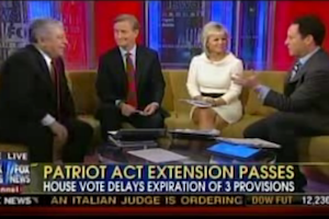 On Fox & Friends this morning, the discussion turned to the recent vote to extend the Patriot Act with Judge Andrew Napolitano serving as the voice of the disappointed since he feels the law goes against the Constitution. After Gretchen Carlson tried to explain to him that the founders didn’t have to deal with scary terrorists like we do, he quickly shut her down. It was a perfect example of what Glenn Beck would call a “spanking.” However, since we still plan on being able to eat our lunches, so we’ll call it a “shutting down.”
