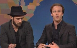 Nicolas Cage (played by Andy Samberg) and Jude Law (played by the man himself) stopped by “Weekend Update” for a recurring segment called “Get In The Cage.” While ostensibly an opportunity for Nicolas Cage to talk to fellow actors about their craft, it was actually an opportunity for Jude Law to look quietly bemused while Cage spouted non-stop nonsense. When he got fed up toward the end Cage cautioned him “There’s only one way to leave the Cage…a fight to the death. Two men enter. Two men and a baby leave.” Cage also gave those of us watching some insight into his curiously prolific movie career, telling Law that he does a new movie every three days. In fact, he was filming one right now. Suprise!
