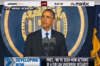 In a speech before the U.S. Naval Academy’s graduating class of 2013, President Barack Obama touched on themes relating to the ongoing scandals surrounding the Internal Revenue Service’s targeting of conservative groups and the Department of Justice’s sweeping subpoenas of reporters’ communications records. Obama praised the spirit of public service that guides America’s civil servants but also chastised the “actions of a few” which can “further erode the peoples’ trust in their government.”