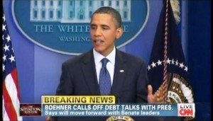 The White House called a rare 6PM Friday press conference in which President Obama apprised reporters in the briefing room of news that Speaker of the House John Boehner (R-OH) had called the president to tell him that he was walking away from negotiations over raising the debt ceiling. Obama said, “The American people are fed up with political posturing and an inability for politicians to take responsible actions as opposed to dodge their responsibilities.”