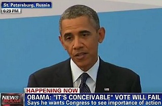 Speaking at a news conference at the G20 summit in St. Petersburg, Russia, on Friday, President Barack Obama addressed the unpopularity of his proposal to intervene in the Syrian civil war. Asked about the level of pressure on Congress to vote against Syrian intervention, Obama said that any military action that is not self-defensive is unpopular. He cited America’s assistance to Great Britain prior to America entering World War II as an example of one such unpopular but necessary conflict in which America participated.