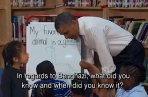 Using some playful audio editing, Leno showed the schoolchildren peppering Obama with questions about the various scandals that continue to plague his administration this week. “In regards to Benghazi,” one child asks, “what did you know and when did you know it?”