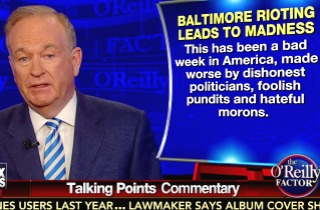 Bill O’Reilly tonight really went off on anyone this week who’s given any sort of defense of the rioting in Baltimore this week, calling them “hateful morons.”