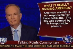 O’Reilly said the big divide in America is between people who “believe in personal responsibility and self-reliance,” and people who want a nanny state government. He brought up the case of Shaaliver Douse, a black teenager who was shot by police for pointing a gun at them. He called the boy a “victim of circumstances that are not being confronted… by the civil rights industry,” continuing his theme of talking about problems of the black family by saying “the boy was doomed by his parents.”