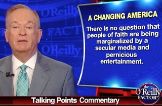 And that troubles O’Reilly, who declared “people of faith are being marginalized b a secular media and pernicious entertainment.” And there’s a corrosive culture to blame, he said, where the rap industry “glorifies depraved behavior,” movies and TV shows “promote non-traditional values,” and people are pushing to legalize certain drugs.