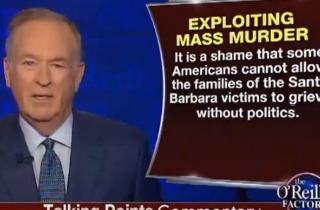 Bill O’Reilly opened his show tonight tearing into people “exploiting the brutal murders in Santa Barbara” this week, scolding anyone who would make a political point “on the backs of innocent people killed in a rampage.” And there were two targets in particular of O’Reilly’s wrath: a Rutgers professor who brought white privilege into the discussion, and a Southern Poverty Law Center spokesman who invoked the War on Women to talk about what could have motivated the shooter.