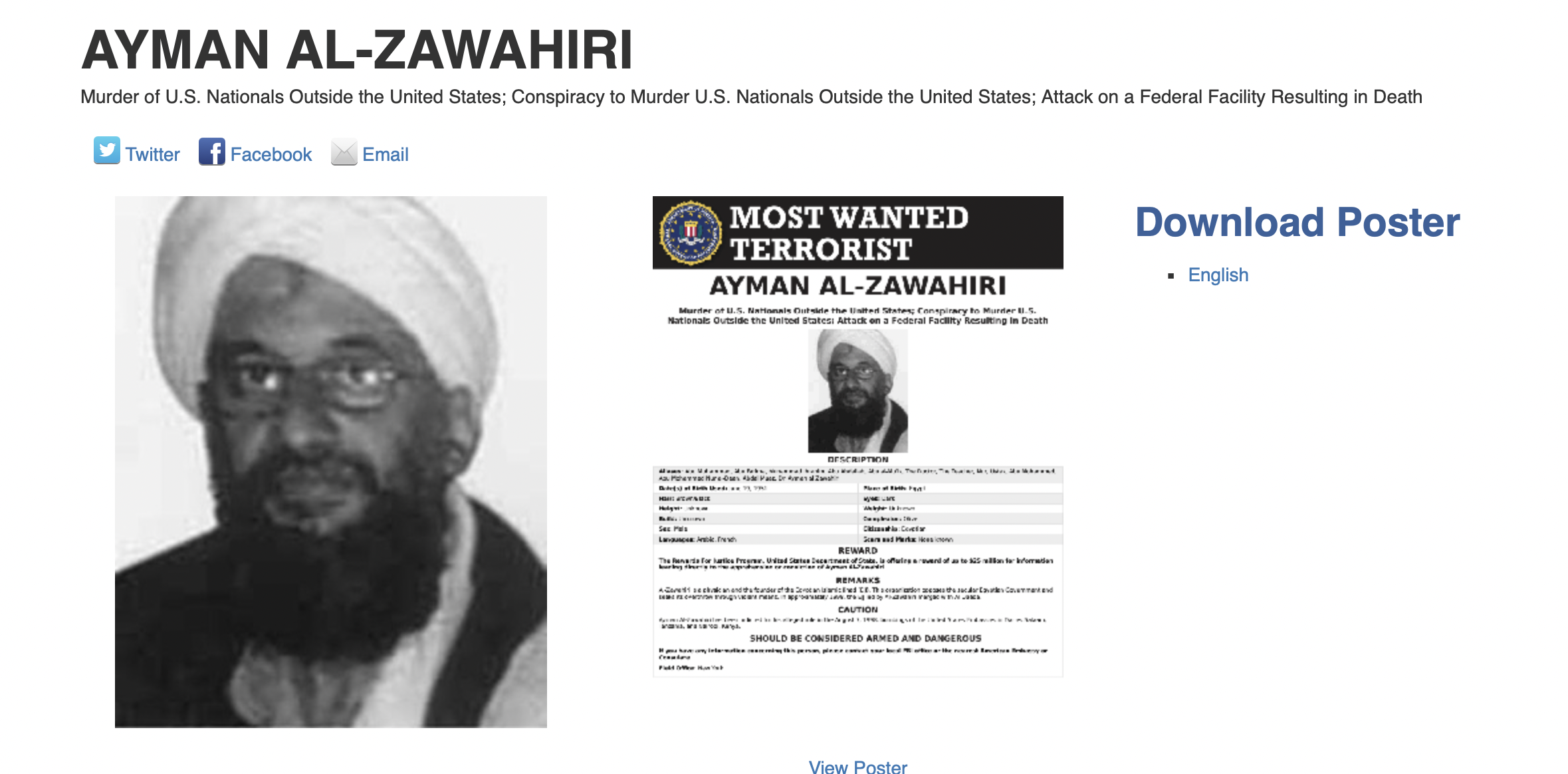 The FBI had him listed as the agency’s most wanted terrorist as of Monday afternoon. A bounty of $25 million had been placed on al-Zawahiri.