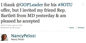 Could the new era of civility come crashing down as a result of one embarrassing rejection? House Majority Leader Eric Cantor invited Former Speaker of the House and current House Minority Leader Nancy Pelosi to sit with him for tonight’s State of the Union Address, but Pelosi has made it clear she already has other plans.