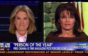 Van Susteren then switched gears to ask Palin her thoughts on Obama being named Time‘s person of the year. Palin was amazed to think that Time would think Obama is striving for “a more perfect union” when, she argued, he has frequently “not… [been] following the Constitution.” However, Palin also outright dismissed the relevancy of Time‘s honors, joking that her own inclusion on the Time 100 in years past says it all.