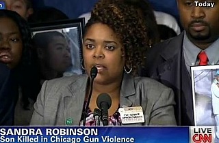 On Wednesday, gun control advocate and mother of a slain Chicago teen, addressed the press along with a group of other grieving victims of gun violence. Sandra Robinson delivered a powerful address calling on lawmakers in Washington D.C. to act in order to prevent further gun-related deaths. “This is genocide in America,” she said during her impassioned address.