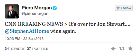 Stewart has yet to respond. But that didn’t stop Morgan from seemingly attempting to continue the (one-sided) feud. When Stephen Colbert and his Colbert Report crew won the Emmy for Outstanding Variety Series, ending The Daily Show‘s 10-year stranglehold on the award, Morgan wrote that “it’s over for Jon Stewart”:
