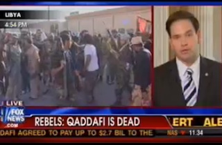 Earlier today, reports surfaced that former Libyan dictator Muammar Gaddafi had been captured and killed by rebel forces. And since its never too early to consider the political impact of any big news, let’s first take a look at Senator Marco Rubio (R-FL), who appeared on Fox News this morning and seemed to give more credit to French and British-led NATO forces over anything accomplished by U.S. forces, or the Obama administration. Sour grapes, or just politics as usual?