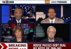 Al Sharpton continues to increase his presence on MSNBC, and last night, filling in as guest host for the The Ed Show, he moderated a discussion between three liberal commentators (Michael Eric Dyson, Bill Press and Laura Flanders) who took turns bashing the Tea Party and expressing disappointment with the debt deal. Sharpton kicked off the conversation wondering whether all future votes on raising the debt ceiling will be held hostage by the political opposition, like it was this time? The guests unanimously responded yes, as long as a Democrat is President.