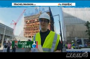 The latest segment of Rachel Maddow‘s “Geek Week,” a report on the construction of the new One World Trade Center, displays many of the qualities that make her show so unique. While many such reports would deliver dry-as-a-bone facts and figures, out-of-context computer simulations, and mawkish archival footage, Maddow eschews the cliche´s in favor of smart-kid wonder and matter-of-fact charm.