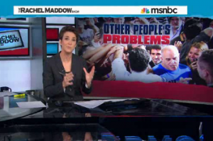 Donating blood or donating money would be better ways to help, she said, but wouldn’t quite make for the ideal photo op. Further criticizing the event, Maddow drew from a BuzzFeed report that said the Romney campaign bought $5,000 worth of canned goods and the like — which were given to attendees to ensure no one stood in line without a donation.