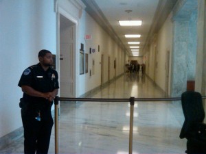 Emily Miller, senior editor of The Washington Times‘ opinion section, revealed via Twitter this afternoon that the hallway leading to Anthony Weiner’s office has been blocked off due to a suspicious package. She posted a photo, at left, of the hall, guarded by a security officer.