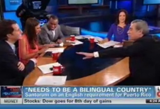 CNN contributor Will Cain (no Santorum fan, he) nevertheless pressed Sec. Gutierrez on the Romney campaign’s response. “In the spokesperson’s comments though, responding to this whole kerfuffle that he brought upon himself,” Cain said, “he said he would not as a prerequisite, this is Romney, require that the people of Puerto Rico cease using Spanish. Senator Santorum had never at any point said they should not be speaking Spanish.”