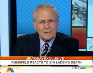 Former Secretary of Defense Donald Rumsfeld appeared on The Today Show this morning and told Matt Lauer that he was proud of the efforts by both President Bush and President Obama to help make Osama bin Laden’s death possible, and that he was impressed by the spontaneous celebration of Americans across the country. However, he also delivered an uncomfortably blunt warning about what might be expected to come next.