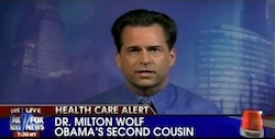 Sean Hannity interviewed Barack Obama‘s second cousin, once removed, who has never met the President. Milton Wolf is a radiologist in Kansas who has recently come out of the woodwork to discuss his (tenuous) family expertise on Obamacare. Guess who’s not a fan of the health reform bill?!