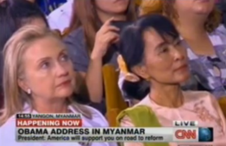CNN’s cameras first checked in with Secretary Clinton about fifteen minutes into the speech, seated next to Nobel Peace Prize winner and former Burmese dissident Aung San Suu Kyi, who is now a member of Burma/Myanmar’s parliament. Sec. Clinton appeared engaged, if a little bit blinky, but by the time the President’s remarks were nearing their finale, the reaction shot was somewhat more, shall we say, subdued: