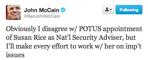 In yet another display of the generational divide among Republicans in the Senate, Sen. John McCain (R-AZ) expressed a very different, more conciliatory reaction to Rice’s appointment on Twitter. Though he has also been a fierce critic of the new national security adviser, he pledged to “make every effort to work with her on important issues.”