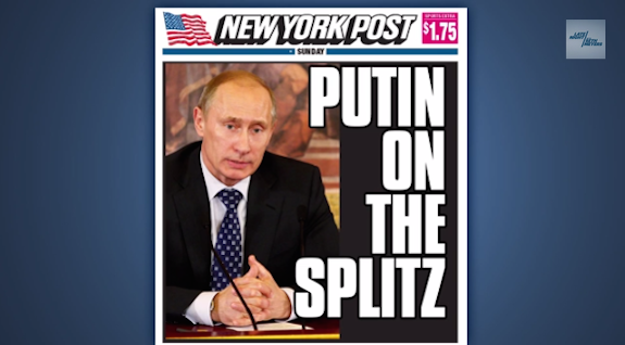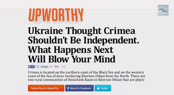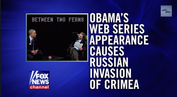 After showing a fairly straightforward headline from AP about the Crimean parliament’s bid to become independent from the rest of Ukraine, Meyers showed his audience headlines from some other notables news sources.