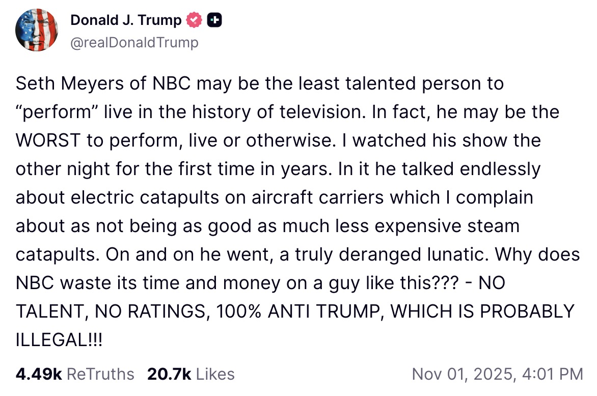 Trump has repeatedly attacked late-night comedians, celebrating the cancellation of Stephen Colbert’s Late Show by CBS, as well as ABC’s temporary suspension of Jimmy Kimmel’s show in September after regulatory pressure from a Trump-appointed FCC chairman.