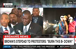 At the very end of their press conference Tuesday afternoon, Michael Brown’s family lawyer Benjamin Crump and Al Sharpton both addressed the controversial outburst from Brown’s stepfather Louis Head, who yelled “Burn this bitch down!” immediately after hearing that Officer Darren Wilson had not been indicted Monday night. Both men condemned that sentiment while at the same time offering their sympathies to a man who was clearly in agony.