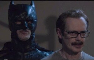 This week’s Digital Short began in classic movie trailer fashion, with Batman consulting with Chief O’Hara, played in this by Steve Buscemi (with the help of an impressive ‘stache). Batman appeared to give the chief crucial information on a rooftop, in his kitchen while he was eating Haagen-Dazs, in the shower, during a prostate exam, and while he wasin bed with his wife, but he always disappeared before the chief could get any significant deets. Things got super weird when Batman changed into a mouse costume and made Kristen Wiig, who was playing his wife, put on some kind of Green Lantern outfit. It was then that we all learned Batman has an ulterior motive…true love!