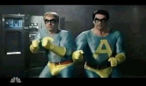 It was a night of firsts on this week’s Saturday Night Live, as Lindsey Buckingham finally getting a word in edgewise on “What up With That?” was followed by Robert Smigel‘s “Ambiguously Gay Duo” going from 2D studs to star-studded live-action. Thanks to an out-of-control “flesh ray,” the cartoon duo turned into Jimmy Fallon and Jon Hamm, and their nemeses were played by a who’s who of comedy that included Steve Carell, Stephen Colbert, and host Ed Helms.