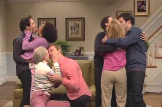 The sketch show broke out its classic “Kissing Family” sketch featuring the Vogelchecks (Fred Armisen, Kirsten Wiig, and Paul Rudd, plus others) who welcomed home their gay son (Andy Samberg) and his boyfriend (Taran Killam). (Uh-oh! A gay couple casually portrayed on TV! Someone page NewsBusters’ resident “the gays on TV” correspondent).