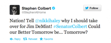 Stephen For Senate? Colbert Enlists Twitter To Convince Gov. Haley To Appoint Him As DeMint’s Successor