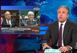 Stewart was thrown by Sebelius taking responsibility and Congress actually asking “surprisingly relevant questions,” but he was back in full mockery mode when Republicans and Democrats alike invoked The Wizard of Oz, with this message for the Democrats.