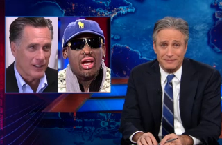 On last night’s Daily Show, Jon Stewart relentlessly mocked Dennis Rodman and Mitt Romney‘s Sunday morning show appearances as “two men trying desperately to figure out what just happened to them.”