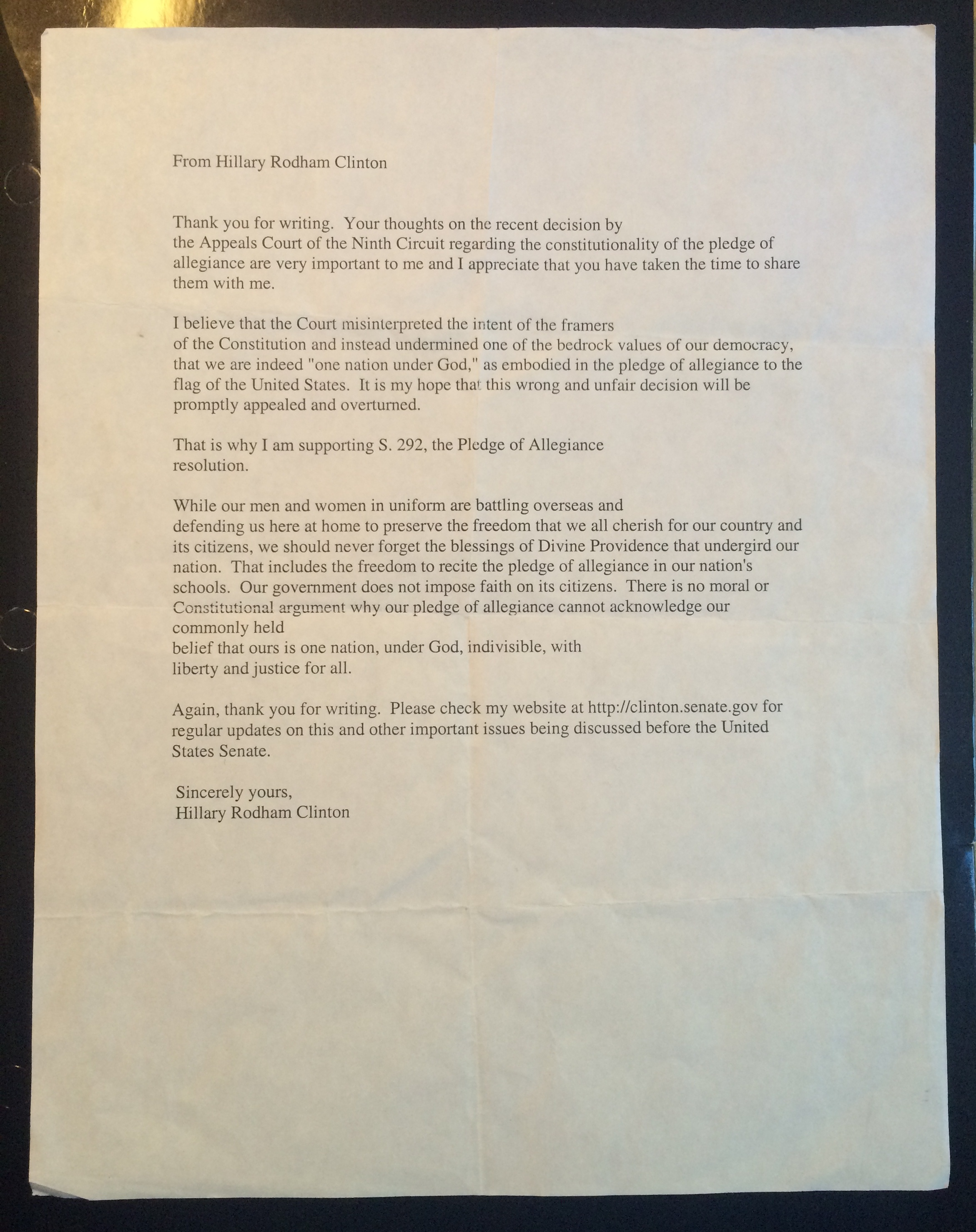 The words “under God” in the Pledge of Allegiance are opposed by some liberals, who consider it an establishment of religion contrary to the First Amendment. Clinton however opposes removing the words from the pledge, as do most Americans.