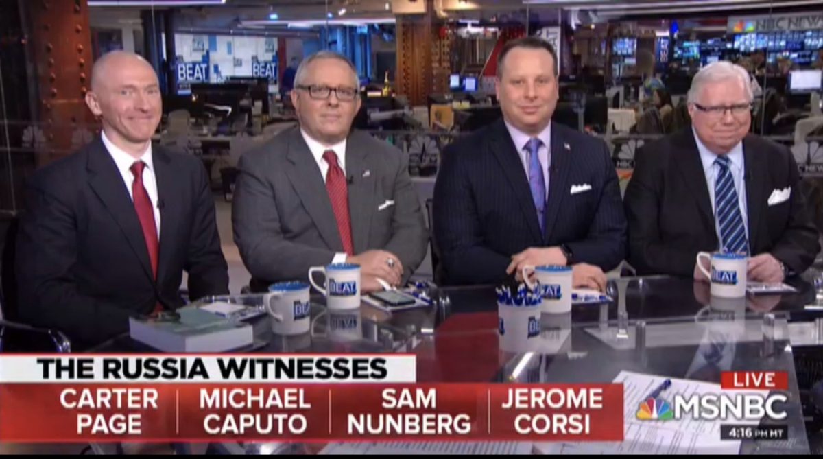 On Wednesday, MSNBC’s Ari Melber had four Mueller witnesses — Carter Page, Sam Nunberg, Jerome Corsi and Michael Caputo — on at the same time.