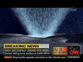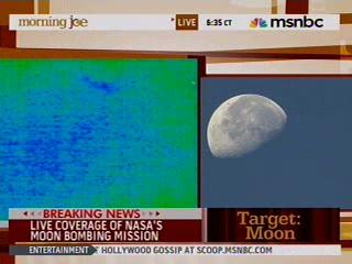 On CNN, John Roberts didn’t have beautiful video, but he did have jokes: “Crashing into the Moon, I guess, is a big scientific deal, but it’s a lot easier to crash into the Moon than it is to land on the Moon.” Also, CNN was the first network to jump back to the original NASA animation they’ve been using all week, since the actual video was pretty unclear: